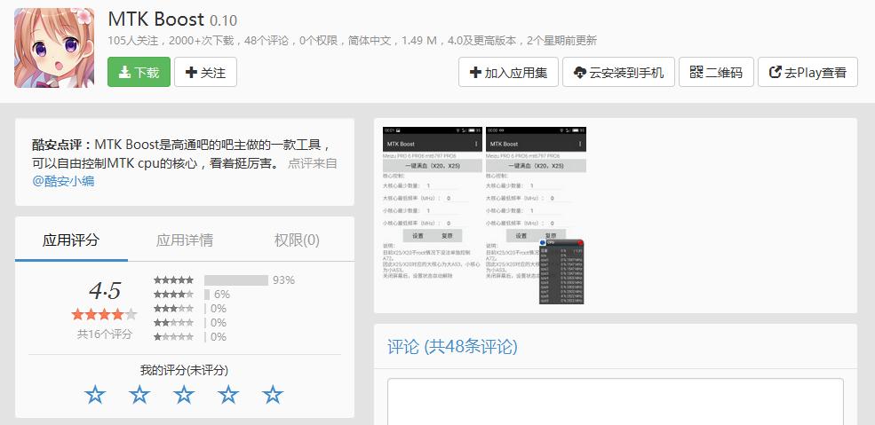 既是出自真正的发烧友之手而非现在满地乱跑的商业软件 ,MTK Boost不会申请任何权限,也没有任何广告,体量也很小,一看就让人觉得很安全放心。